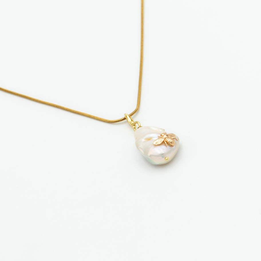 Melia - dal latino “miele”- è una collana in argento 925 placcato oro, arricchita da una perla barocca d’acqua dolce dalle forme morbide e organiche, impreziosita da un piccolo elemento decorativo dorato a forma di ape.